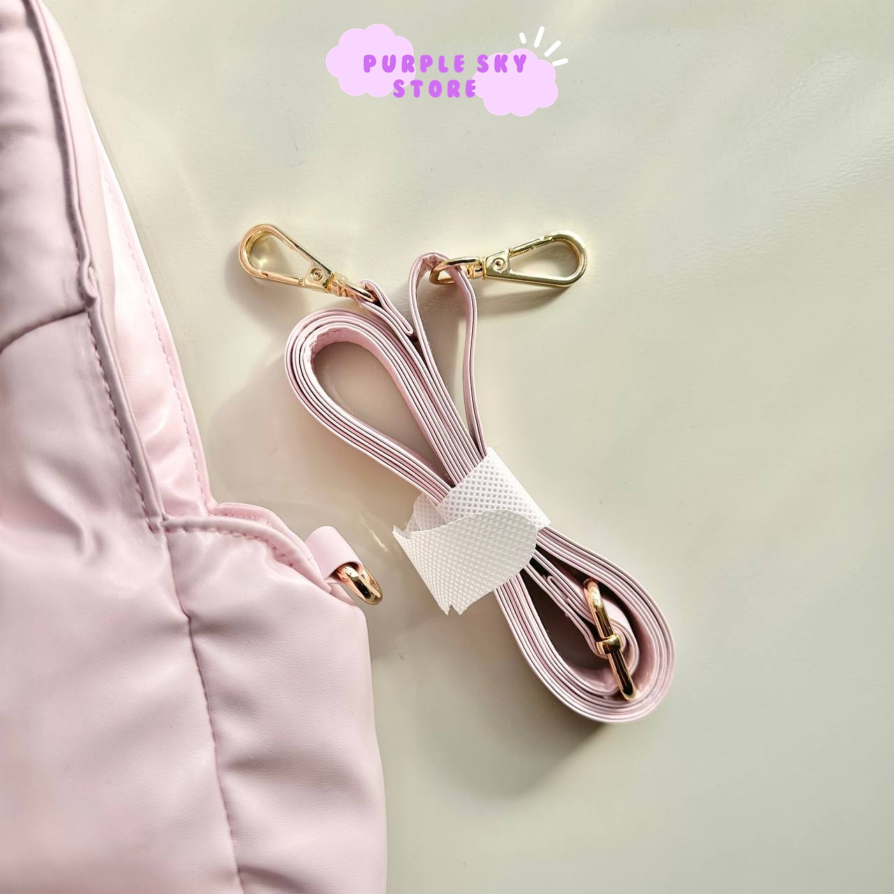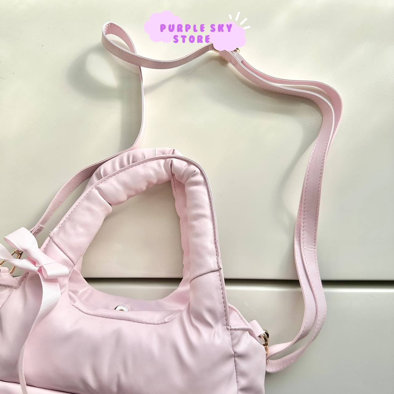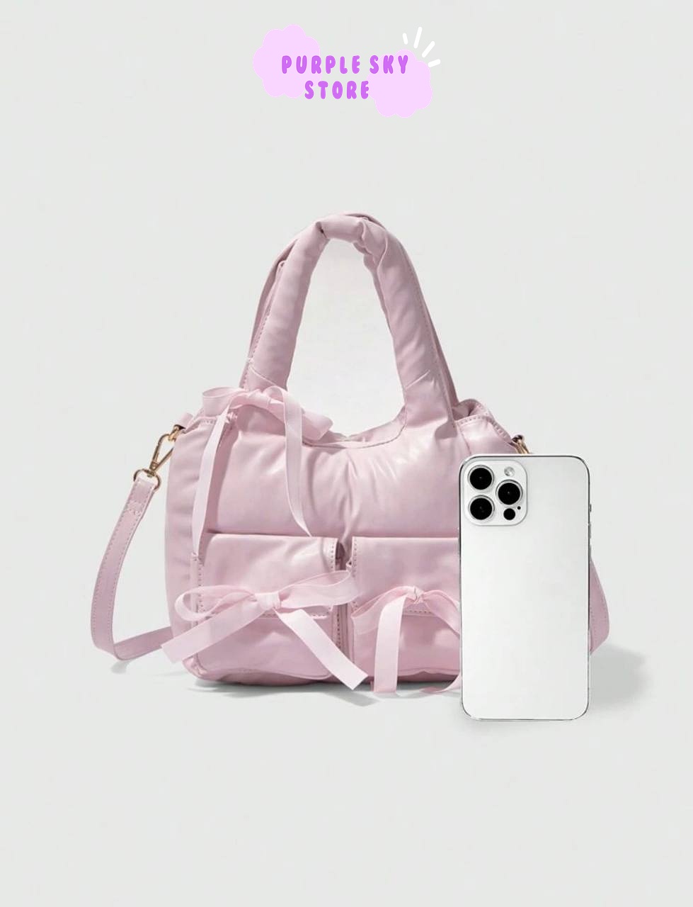 حقيبة متوسطة الحجم بلون وردي ناعم، مصنوعة من الجلد بملمس مريح.